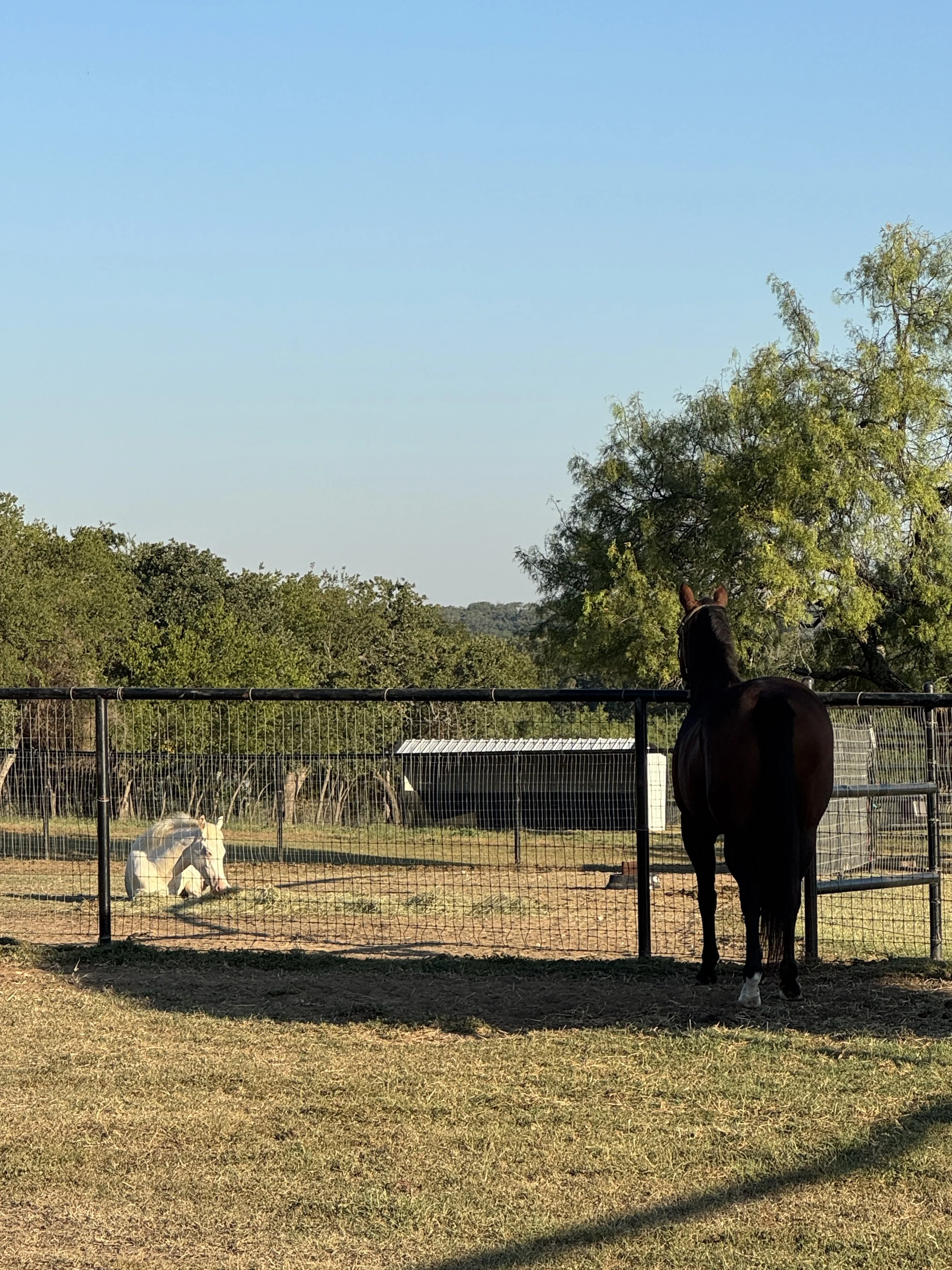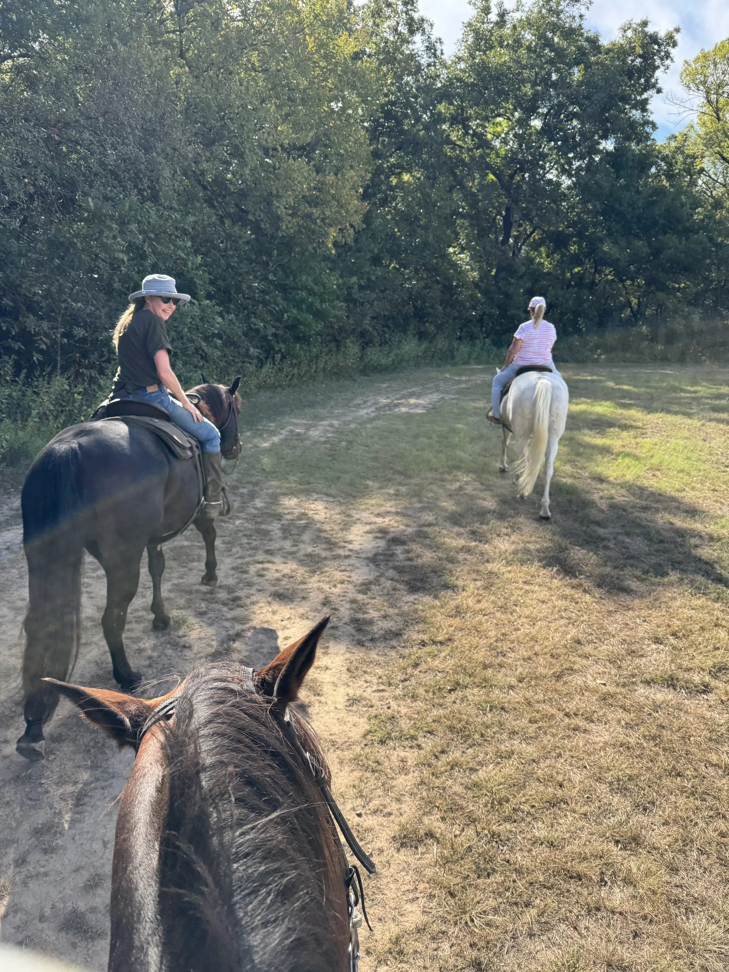We’ve spent our mornings exploring the property. The cooler fall weather has made our rides glorious. We’ve wandered along fence lines past cattle and goats, under trees filled with birds, and beside a deer feeder (no deer sightings yet). Now and then we hear squirrels and other woodland critters rustling in the brush, which keeps both of us alert.