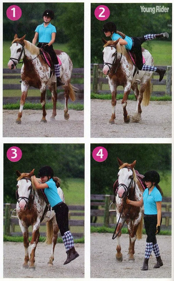 Placing hands on the horse's neck/saddle for support, leaning forward, and swinging your legs over the back to land on your feet