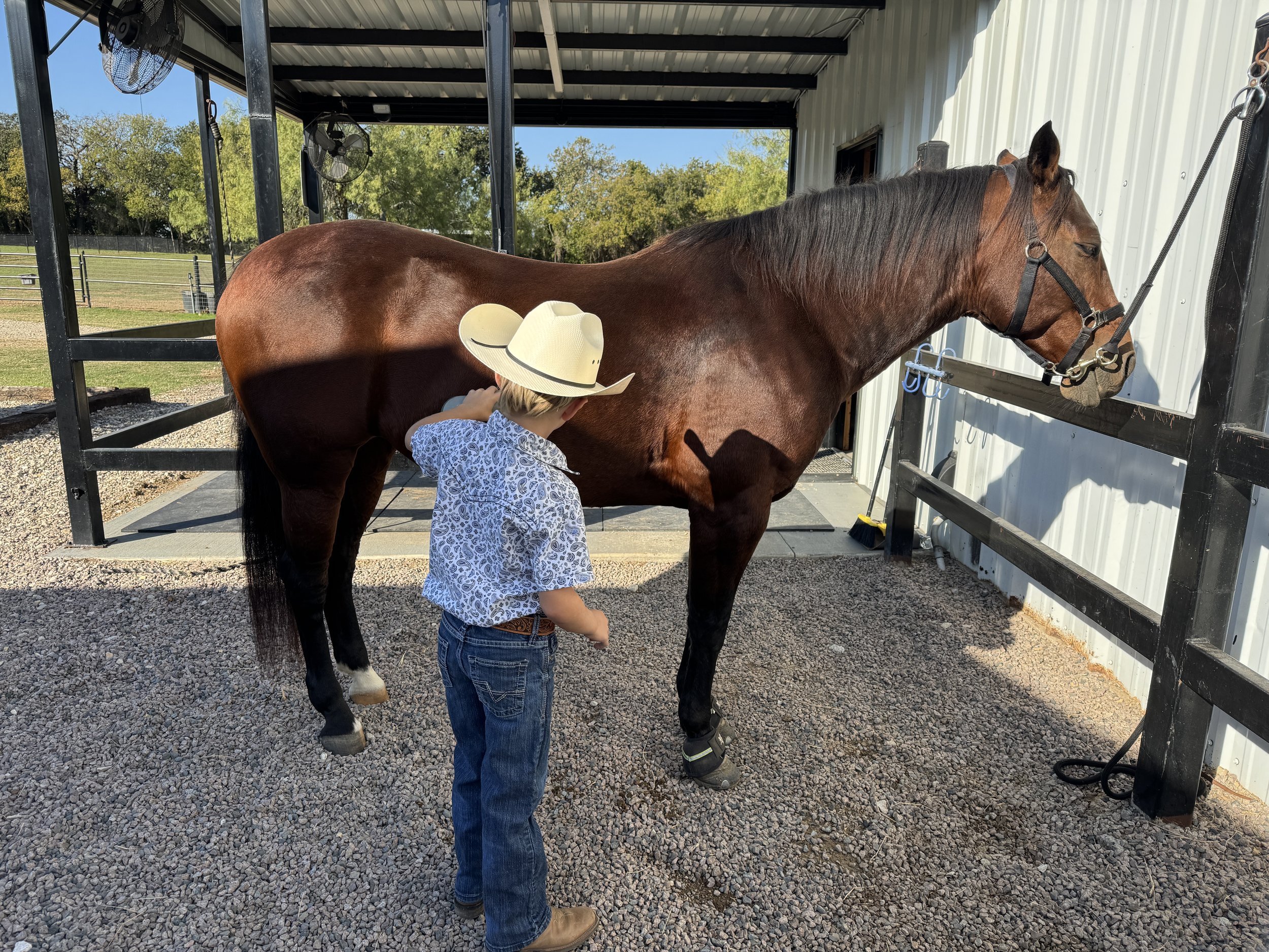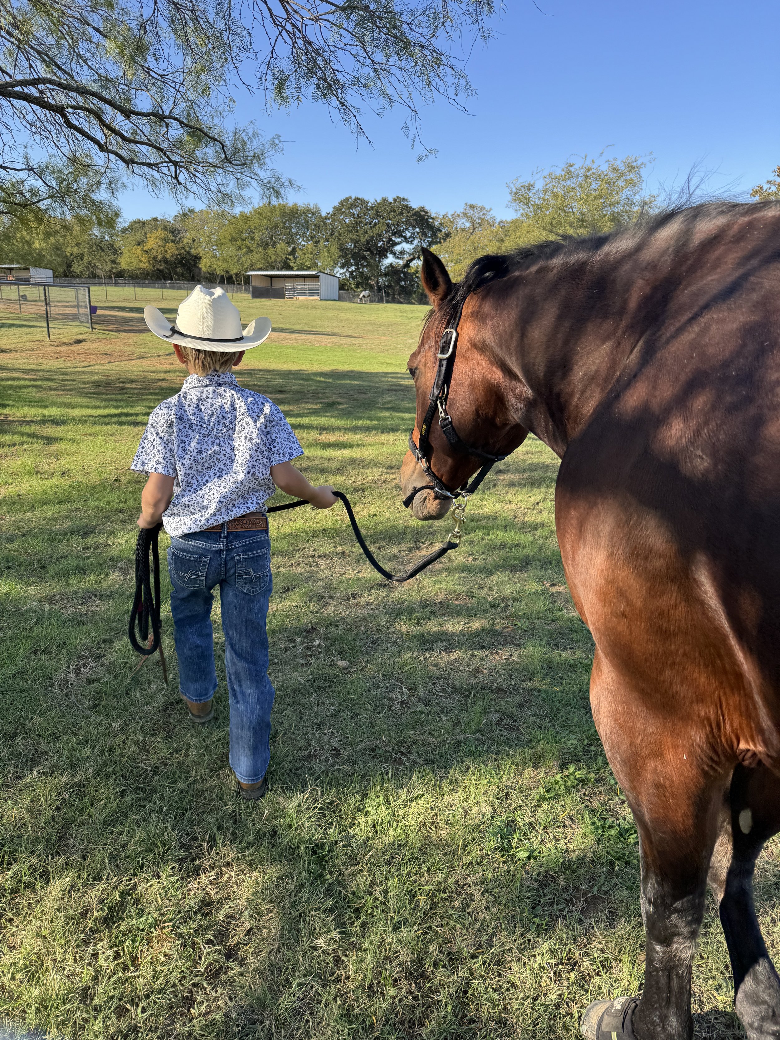 I also had a little help this week — a young cowboy who’s the barn manager’s grandson. He raises cattle at home, loves to ride, and is as talkative as the day is long. He helped me by getting Bee from the pasture. She couldn’t have been sweeter, walking quietly beside him and loving the extra grooming attention he gave her. Watching her gentle side come through reminded me just how far she’s come since those early days together.